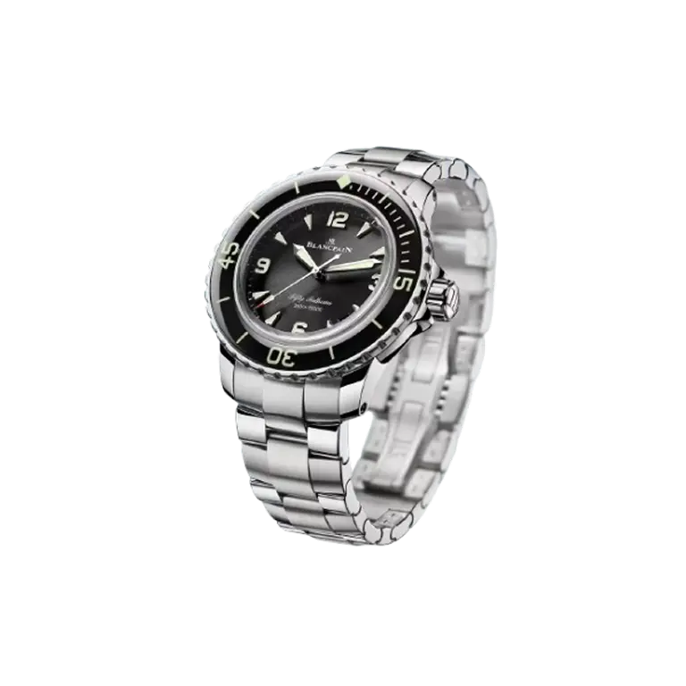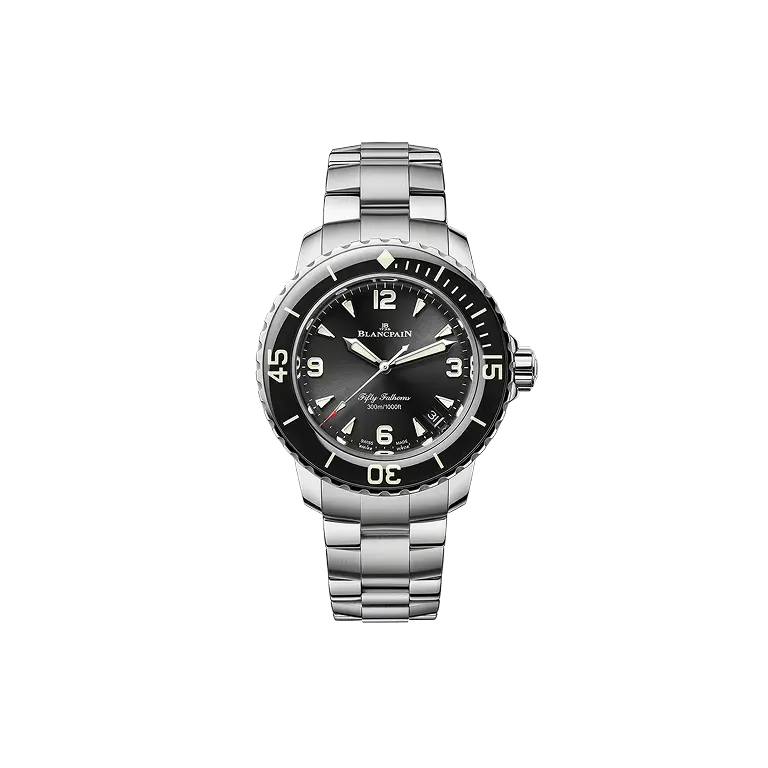 Contact Us Call UsThe Fifty Fathoms Automatique exemplifies Blancpain’s legacy of innovation and excellence in diving timepieces. Crafted in polished steel, this 38.20 mm timepiece features a sunburst black dial with a date display and sweeping seconds hand, complemented by a unidirectional sapphire bezel for exceptional legibility. Powered by the self-winding caliber 1150, it offers a 100-hour power reserve and incorporates Blancpain’s secured movement, ensuring precision and durability over time. Water-resistant to 30 bar, it is paired with a polished steel bracelet and folding clasp, blending technical performance with refined elegance in the Fifty Fathoms Automatique collection.