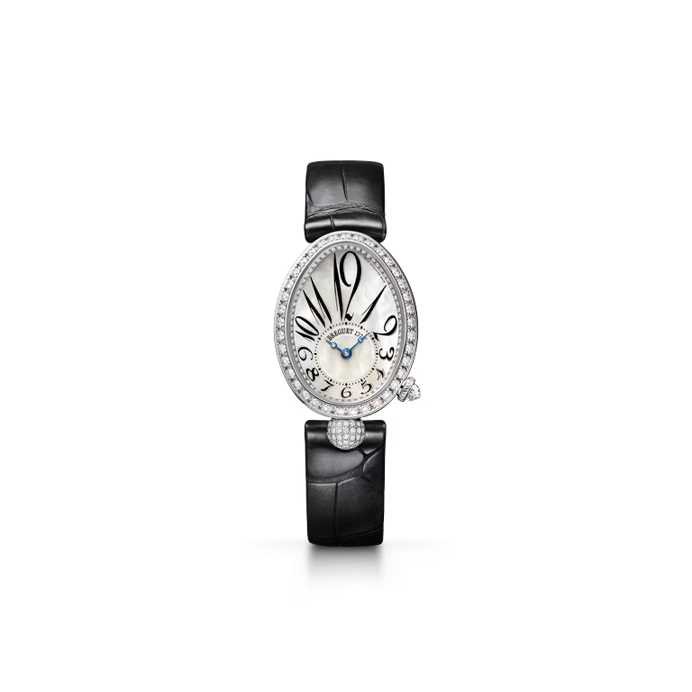 Its elegantly offset hours, minutes, and small seconds add visual intrigue, while the finely executed automatic movement is visible through the sapphire caseback. Finished with a luxurious white alligator strap, this delicate creation perfectly blends timeless femininity with Breguet’s uncompromising craftsmanship.