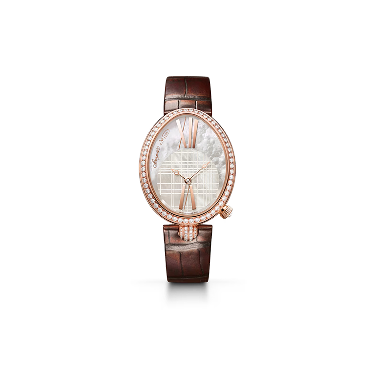 Contact Us Call UsWith its 43 x 34.95 mm case, it is one of the largest models of the Reine de Naples collection. Its white mother-of-pearl dial follows the curvature of the case, in addition to the two large curved markers in rose gold, located at 6 and 12 o’clock. Set with diamonds, the bezel enhances the sparkle of the crown and the ball attachment, decorated with an inverted diamond and brilliant-cut diamonds, respectively.