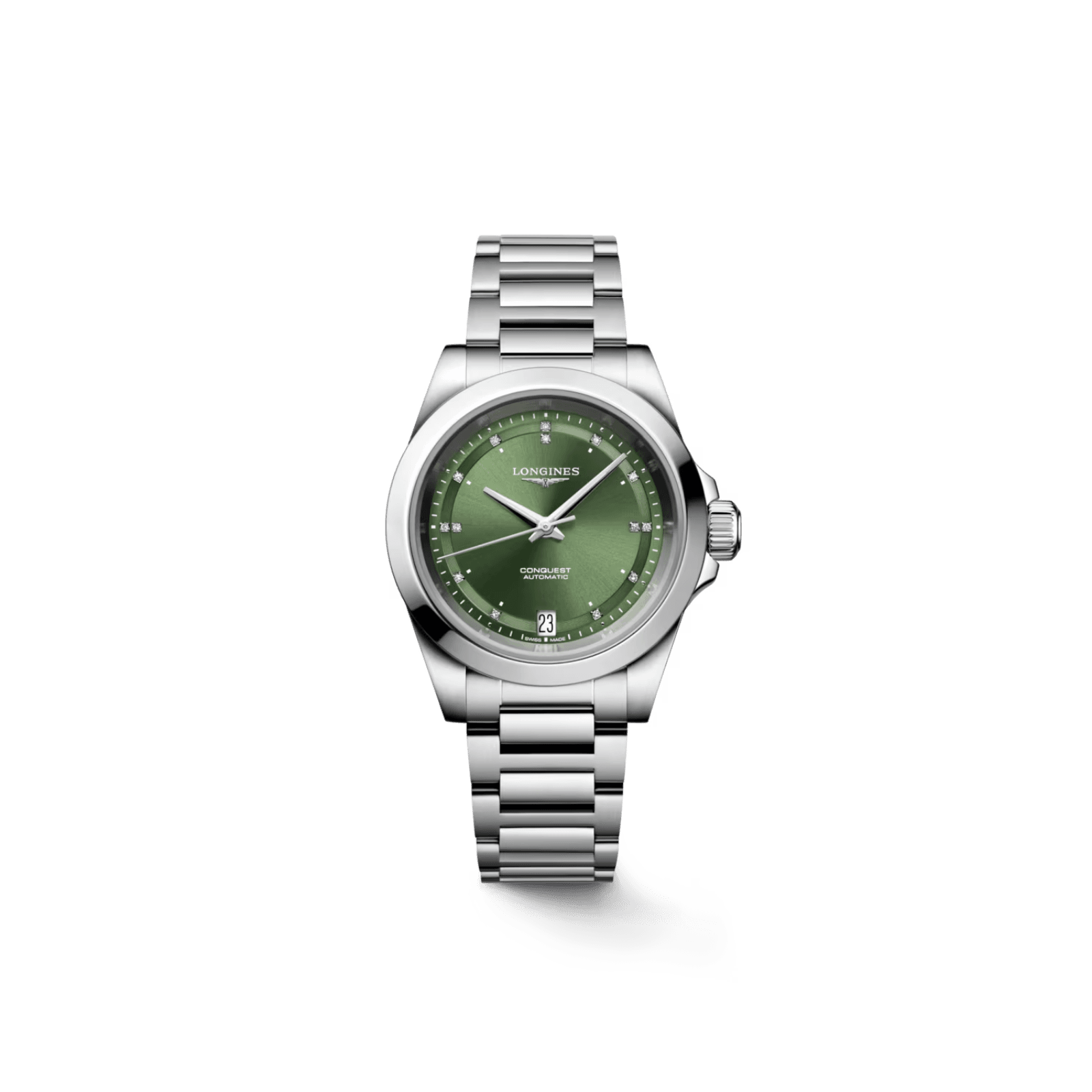 Contact UsDiscover the Conquest 38mm Sunray Green Dial. Crafted from stainless steel, this watch features a round 38.00 mm case with a scratch-resistant sapphire crystal, offering exceptional durability and clarity. The sunray green dial, adorned with applied indexes and silvered polished hands enhanced with Swiss Super-LumiNova®, ensures excellent readability.