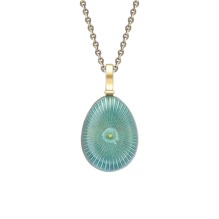 The Heritage Yellow Gold & Teal Enamel Egg Pendant features teal enamel with starburst guilloché, set in 18 karat yellow gold. The egg pendant is 16mm and comes with an 18 karat yellow gold chain.