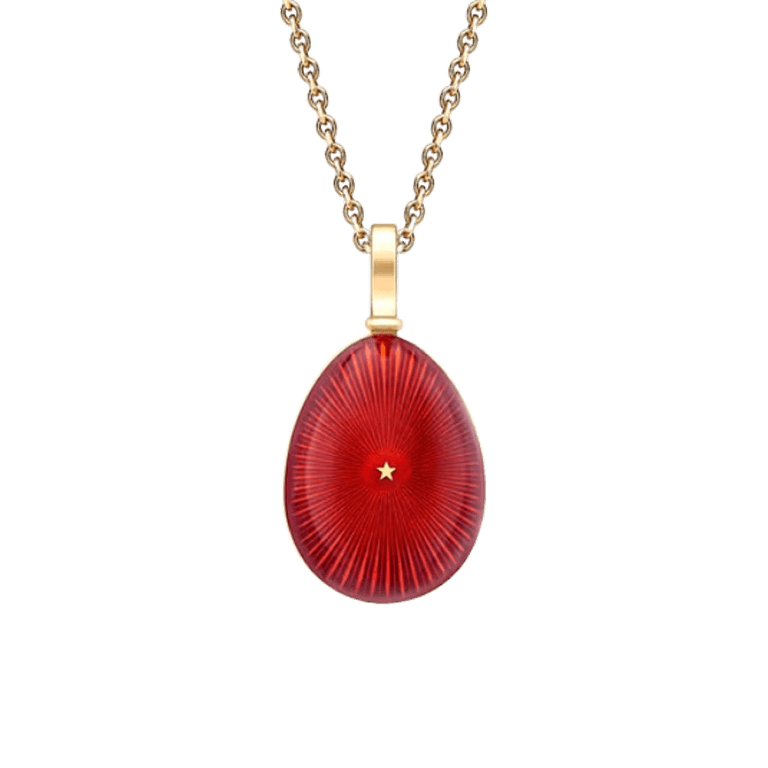 The Heritage Yellow Gold & Red Enamel Egg Pendant features red enamel with starburst guilloché, set in 18 karat yellow gold. The egg pendant is 16mm and comes with an 18 karat yellow gold chain.