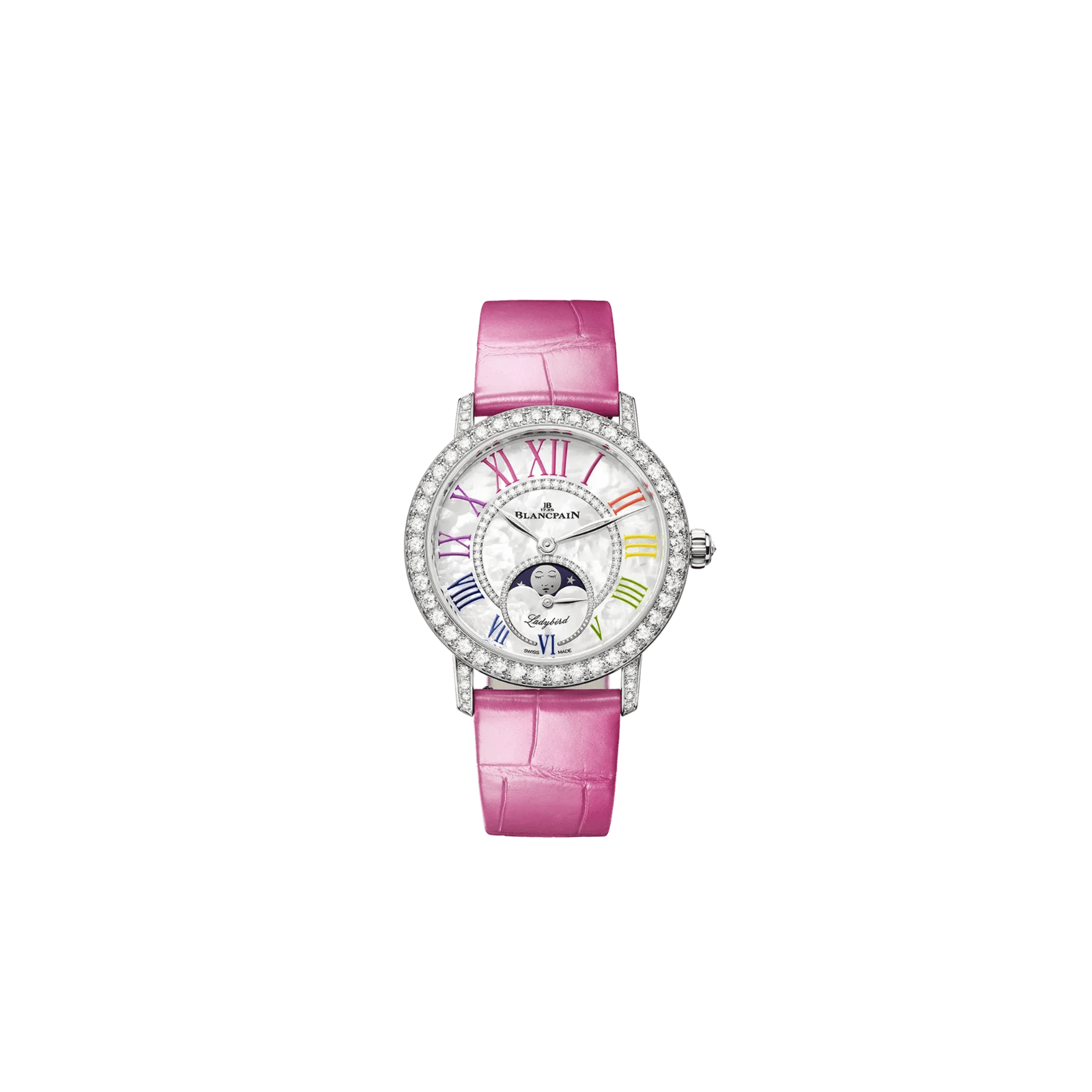 Contact Us Call UsThe Ladybird Colors Phases de Lune is an exquisite timepiece that exemplifies Blancpain’s masterful artistry and craftsmanship. Encrusted with a remarkable total of 2.29 carats of brilliant-cut diamonds, this stunning watch dazzles with its luxurious design, which extends gracefully across the bezel, dial, case, and buckle. With a refined diameter of 34.9 mm, the watch is meticulously crafted from high-quality 18-carat white gold, radiating elegance and sophistication. The mother-of-pearl dial adds a touch of opulence, offering a soft, luminous backdrop that perfectly contrasts the shimmering diamonds.
