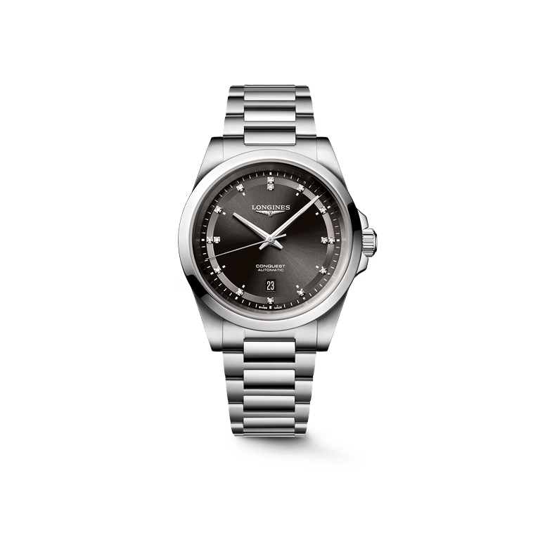 A striking fusion of performance and luxury, the Longines Conquest L3.830.4.57.6 redefines modern masculinity with confidence and refinement. Rooted in the collection’s legacy of sporting excellence—first launched in 1954—this 41 mm timepiece elevates the classic sports watch with unexpected brilliance: a sunray black dial adorned with diamonds, yet built to meet the demands of an active life.