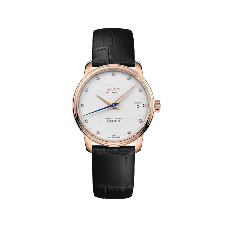 A refined expression of elegance and precision, the Mido Baroncelli Chronometer M027.208.36.036.00 blends timeless classic design with modern Swiss watchmaking excellence. Its slender 34 mm stainless-steel case, treated with rose-gold-coloured PVD coating, delivers a warm, luxurious presence on the wrist — a thoughtful balance between jewellery-like elegance and functional durability.