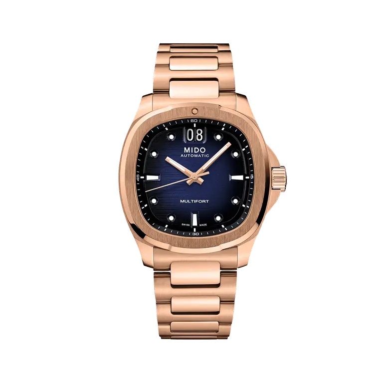 Contact Us Call UsA brilliant flashback! Born from MIDO’s extraordinary heritage, the TV-shaped case returns to centre stage for the Multifort TV Big Date, as intense as it is precise, thanks to its formidable mechanical movement. The modern and dynamic design of this Swiss watch is highlighted by a striking dial and, along with its distinctive function: the BIG DATE at 12 o’clock. Its formidable latest-generation automatic movement, Caliber 80, is equipped with a high-tech balance spring in Nivachron™, which offers outstanding resistance to shocks and magnetic fields.