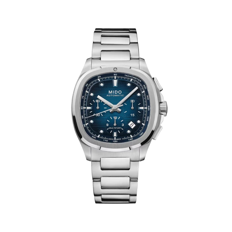 An eye-catching design! True to MIDO’s bold spirit, the Multifort TV Chronograph asserts its character with a uniquely styled TV-shaped case. Its contemporary silhouette is enhanced by a horizontally brushed dial, brought to life by two subtly integrated counters and contrasting details that highlight its personality. At its core ticks the Caliber 60 – a high-precision Swiss automatic movement – delivering up to 60 hours of power reserve. Technical, expressive, and perfectly balanced, this timepiece is built to accompany every standout moment of daily life. It is delivered with an additional strap, offering even greater versatility and comfort.