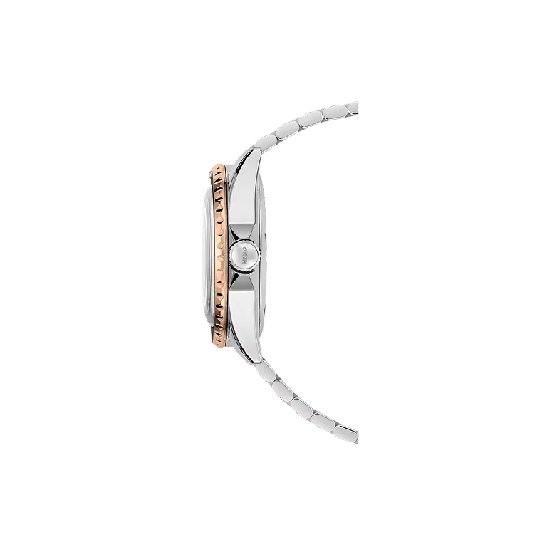 • Stainless steel with rose gold PVD coating 40.50mm round case with rotating bezel (13.4mm thickness)