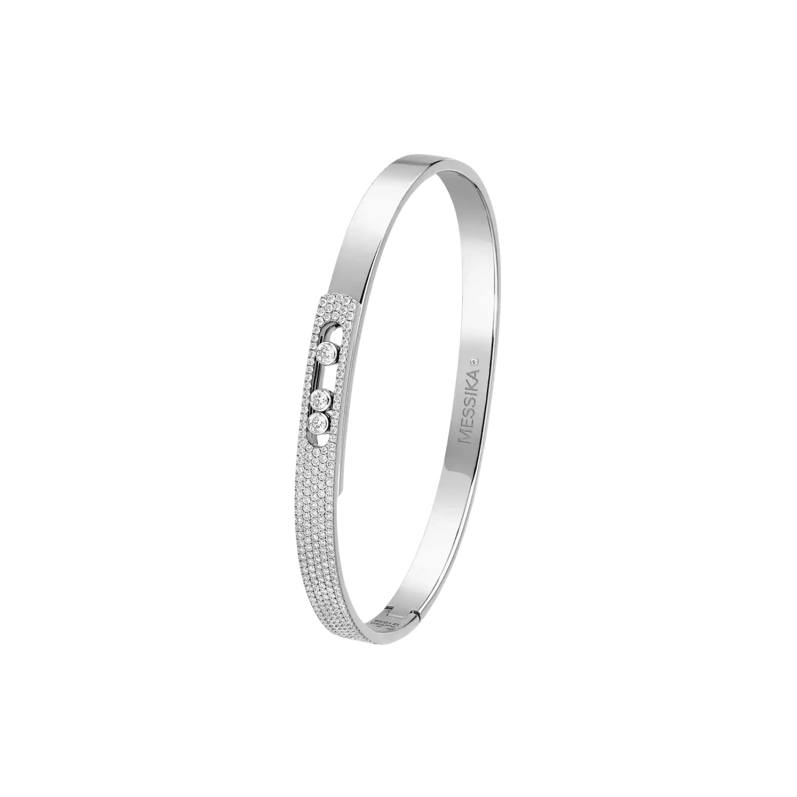 The white gold pavé-set diamond bangle bracelet is all the more irresistible for the play of light it creates in pairing exquisite gold with three sparkling, moving diamonds and the glittering pavé-diamond setting that surrounds them. This luxury jewelry piece is understated enough to wear every day, on its own or layered with other pieces.