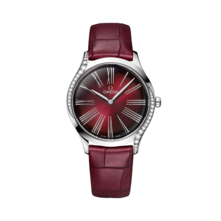 The slim 36 mm case is made from stainless steel and features diamond paving that curves along each side, as well as a crown that is polished with red “HyCeram” and set with a single diamond. The lacquered gradient burgundy dial includes unique transferred Roman numerals, while the hands are rhodium-plated.