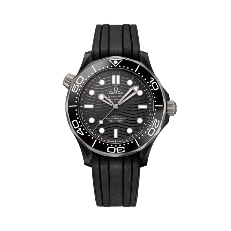 The watch is presented on an integrated black rubber strap with a polished-brushed black ceramic [ZrO2] buckle, and is driven by the OMEGA Master Chronometer Calibre 8806, which can be seen through the sapphire-crystal on the wave-edged caseback