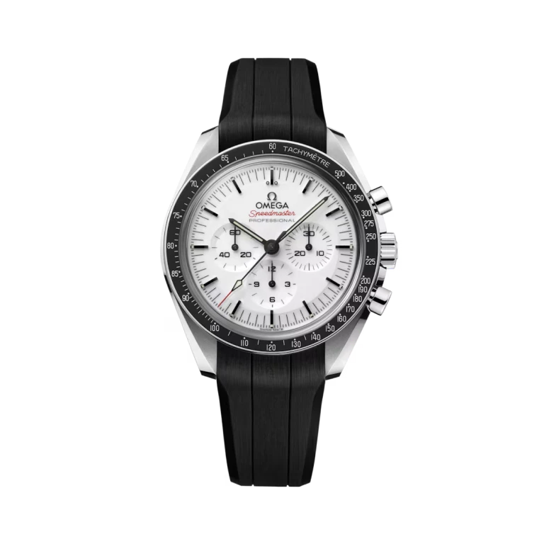 This 42 mm Moonwatch in stainless steel features sapphire crystal glass on the front as well as on the caseback. Inspired by the 4th generation Speedmaster style worn on the moon, it also includes an asymmetrical case, a white lacquered step dial with applied OMEGA logo and indexes, Moonwatch style hands, and the famous dot over 90 on the black anodised aluminium bezel ring.
