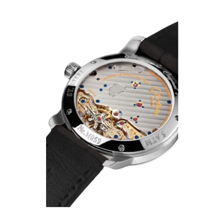 Contact Us Call UsThis elegant mechanical timepiece with manual winding is fitted with a 40 mm case in stainless steel and impresses with its asymmetric dial visuals. Four different strap versions are available: a black Louisiana alligator leather strap, two synthetic fabric straps in grey or dark blue made from recycled fishing nets, and a link bracelet in stainless steel with fine adjustment mechanism.