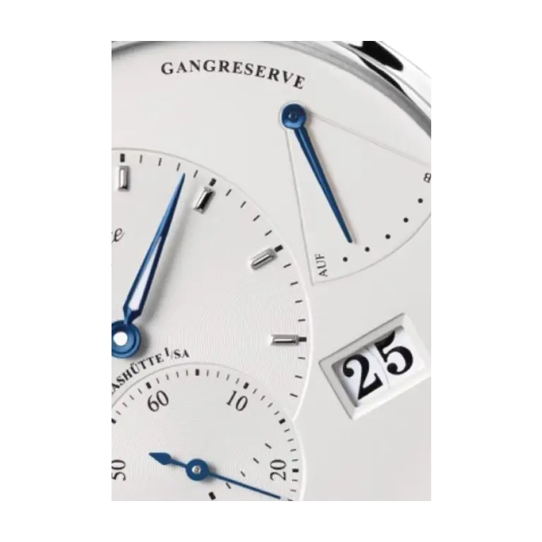 A discreet display on the right side of the dial indicates how much energy remains available in the spring barrel. If the small blued hand points to the “AUF” mark, the watch is fully wound. The closer this hand moves toward the “AB” mark, the less power remains available. When fully wound, the PanoReserve has a power reserve of 42 hours.